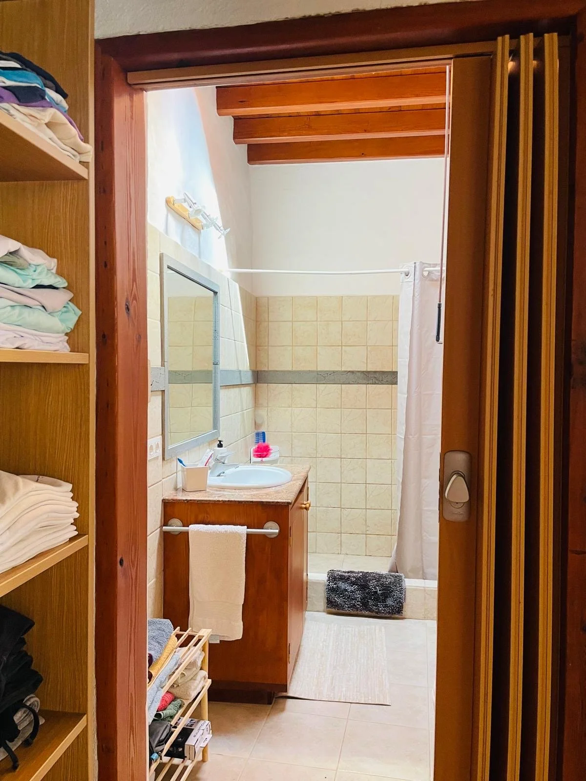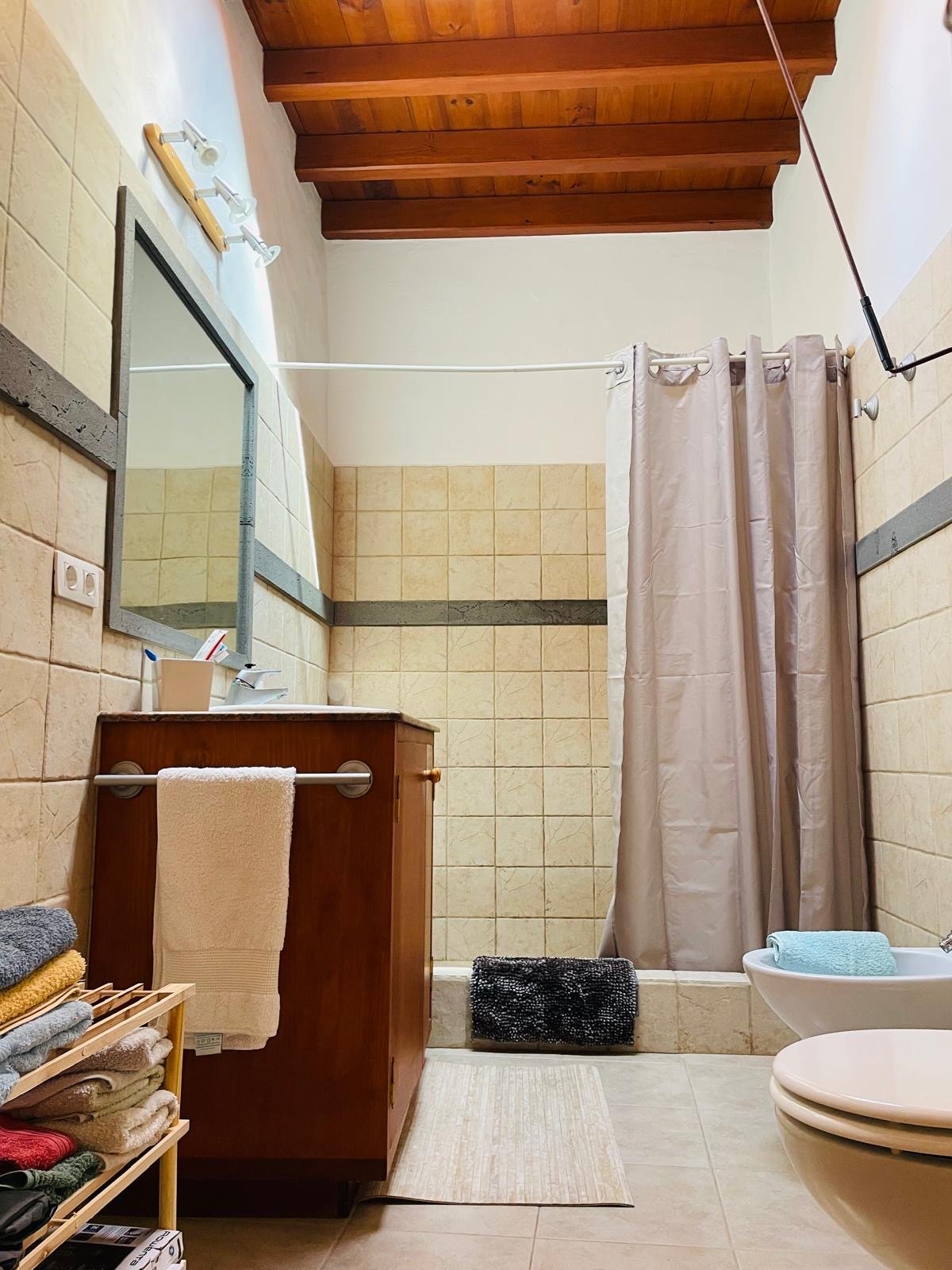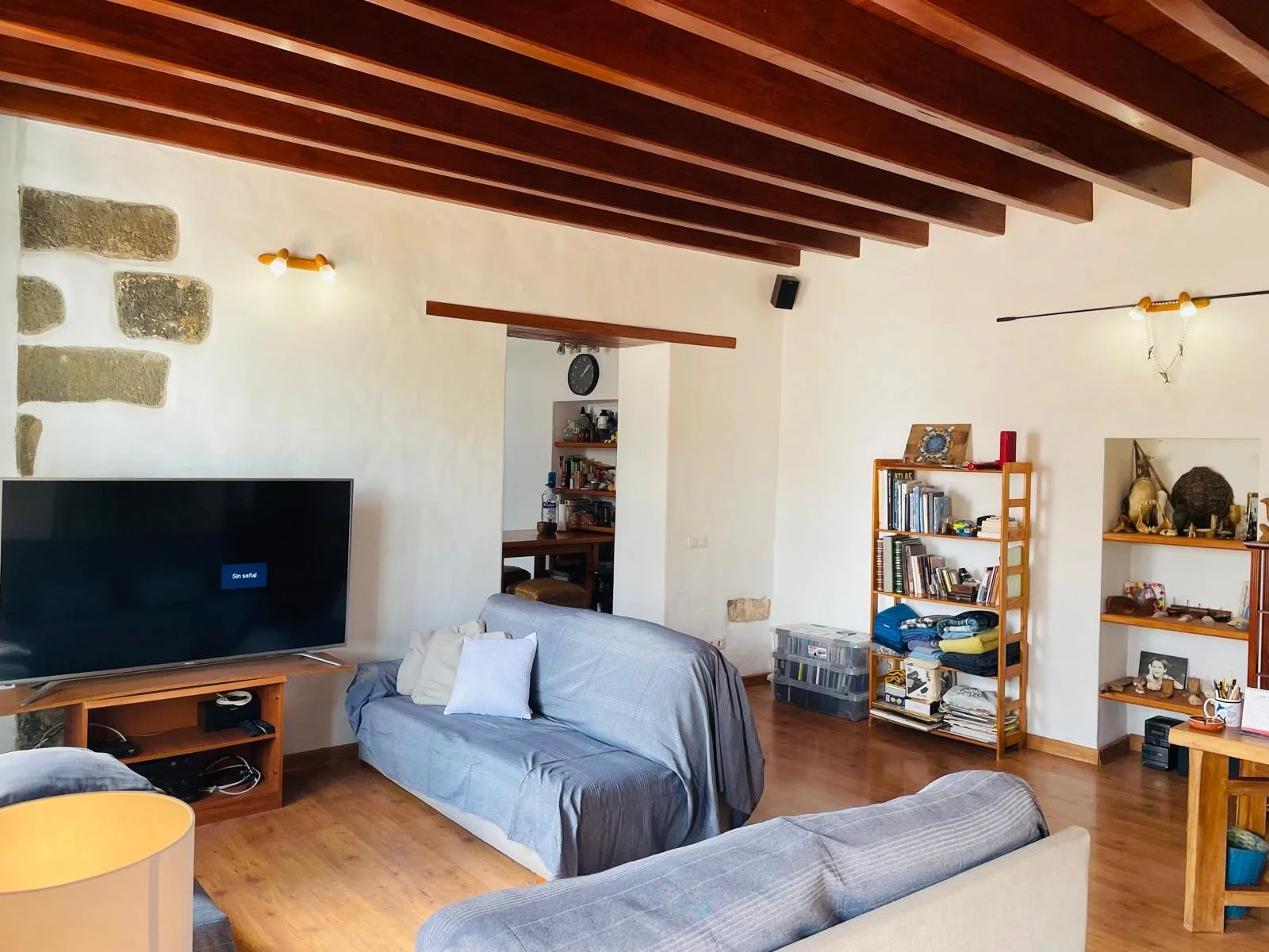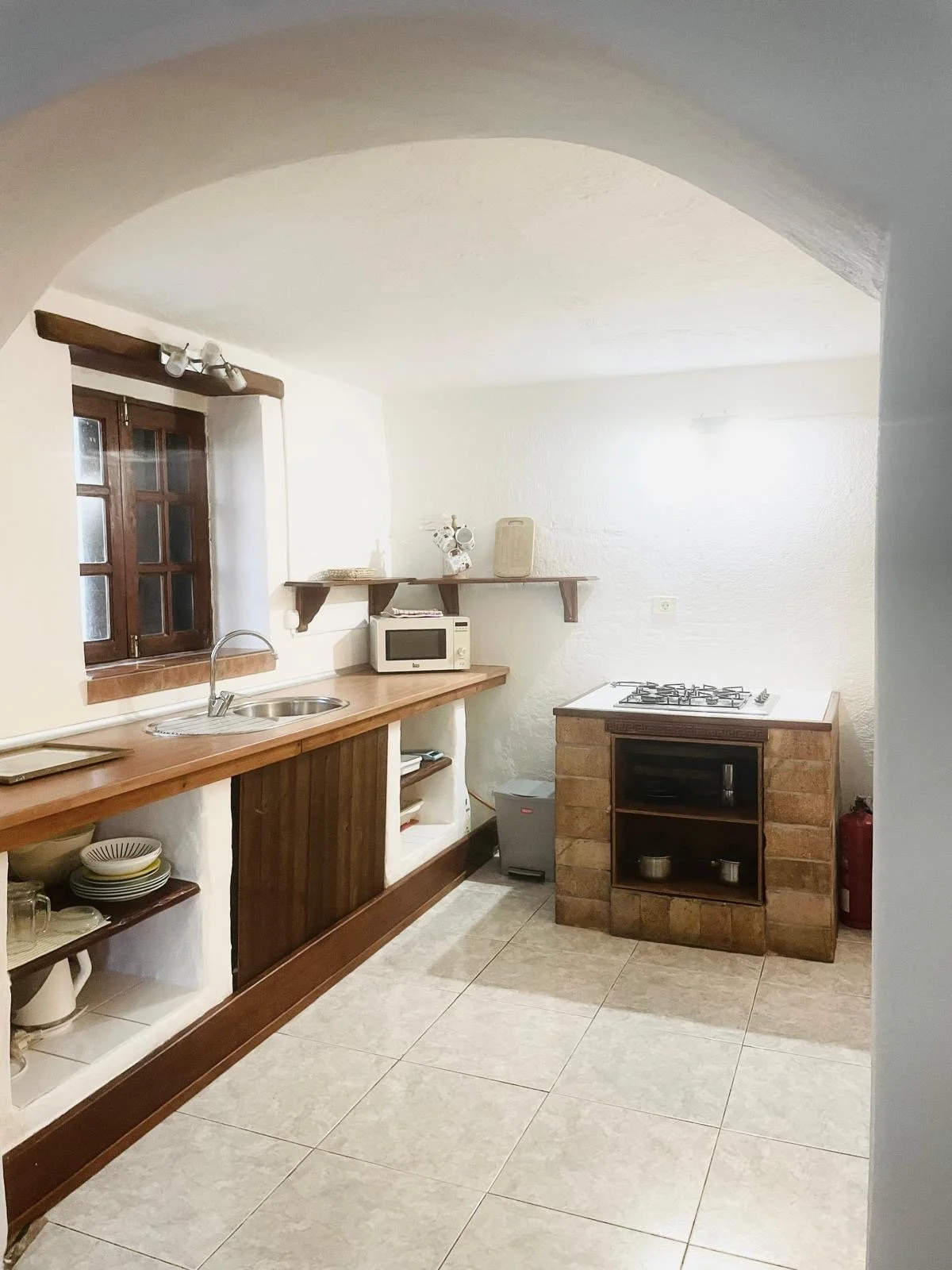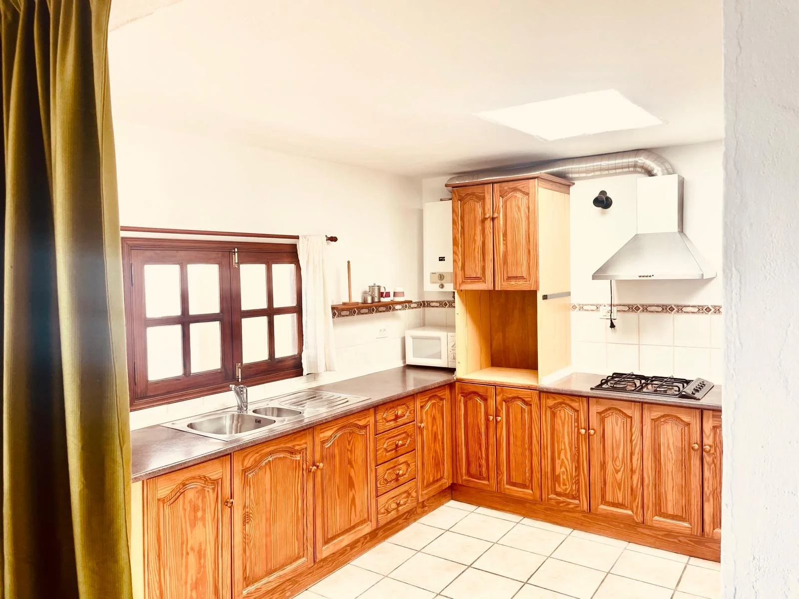 The main house offers two spacious living rooms, with a functional and welcoming kitchen situated between them. It includes two bedrooms — one with an en-suite bathroom — as well as an additional independent bathroom. The wooden ceilings and floors enhance the warm atmosphere and maintain the home’s rustic charm.